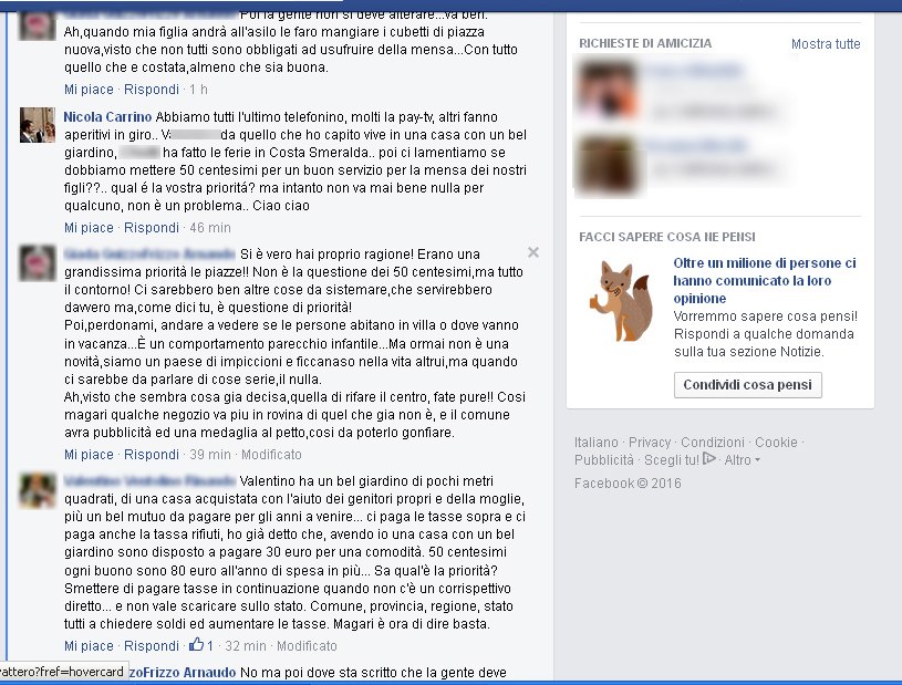 Naturalmente le affermazioni dell’assessore hanno scatenato un mezzo putiferio che è andato via via aumentano anche perché la discussione, dal generale e dallo specifico è finita per trasformarsi nel personale. Sempre Carrino, che è anche il segretario della lega Nord in valle Varaita nonché dipendente dell’Agenzia delle Entrate citando i nominativi di alcuni autori dei commenti ha scritto: “Abbiamo tutti l'ultimo telefonino, molti la pay-tv, altri fanno aperitivi in giro.. XXX da quello che ho capito vive in una casa con un bel giardino, XXX ha fatto le ferie in Costa Smeralda.. poi ci lamentiamo se dobbiamo mettere 50 centesimi per un buon servizio per la mensa dei nostri figli??.. Qual é la vostra priorità?”. Il botta e risposta è andato avanti perdendo sempre più il filo del discorso iniziale. Così sono entrati in ballo i lavori delle piazze accompagnati dalle lamentele di chi – ha dichiarato – di percepire pensioni da fame perché la parte pubblica sperpera denaro. Quindi, ha sentenziato Carrino “tra politica (da tutte le parti) e sindacato, dipendenti pubblici che rubano ecc. ecc. La situazione é vergognosa.. Magari sul sindacato può darci una risposta XXX.” alludendo al presunto impegno della signora autrice di un post. Così, post dopo post, la discussione è sempre più andata fuori dei binari.