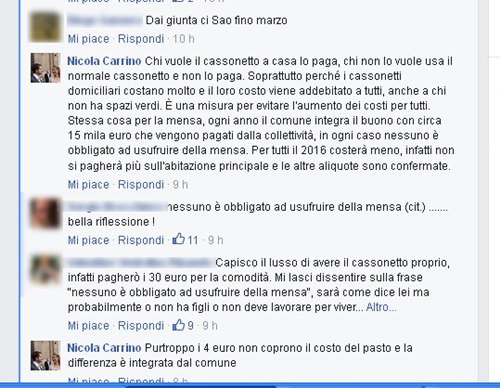 Naturalmente le affermazioni dell’assessore hanno scatenato un mezzo putiferio che è andato via via aumentano anche perché la discussione, dal generale e dallo specifico è finita per trasformarsi nel personale. Sempre Carrino, che è anche il segretario della lega Nord in valle Varaita nonché dipendente dell’Agenzia delle Entrate citando i nominativi di alcuni autori dei commenti ha scritto: “Abbiamo tutti l'ultimo telefonino, molti la pay-tv, altri fanno aperitivi in giro.. XXX da quello che ho capito vive in una casa con un bel giardino, XXX ha fatto le ferie in Costa Smeralda.. poi ci lamentiamo se dobbiamo mettere 50 centesimi per un buon servizio per la mensa dei nostri figli??.. Qual é la vostra priorità?”. Il botta e risposta è andato avanti perdendo sempre più il filo del discorso iniziale. Così sono entrati in ballo i lavori delle piazze accompagnati dalle lamentele di chi – ha dichiarato – di percepire pensioni da fame perché la parte pubblica sperpera denaro. Quindi, ha sentenziato Carrino “tra politica (da tutte le parti) e sindacato, dipendenti pubblici che rubano ecc. ecc. La situazione é vergognosa.. Magari sul sindacato può darci una risposta XXX.” alludendo al presunto impegno della signora autrice di un post. Così, post dopo post, la discussione è sempre più andata fuori dei binari.